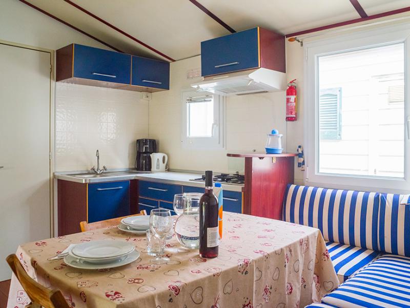 Domek o powierzchni 33 m2, plus zadaszona i wyposażona drewniana weranda, jest idealny dla dużych rodzin do sześciu osób. Spokojna lokalizacja w pobliżu wszystkich usług dostępnych na terenie campingu, otoczona roślinnością typową dla tego regionu.