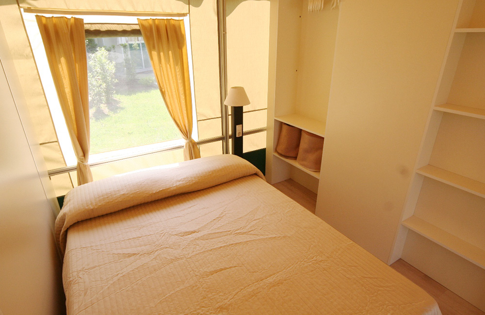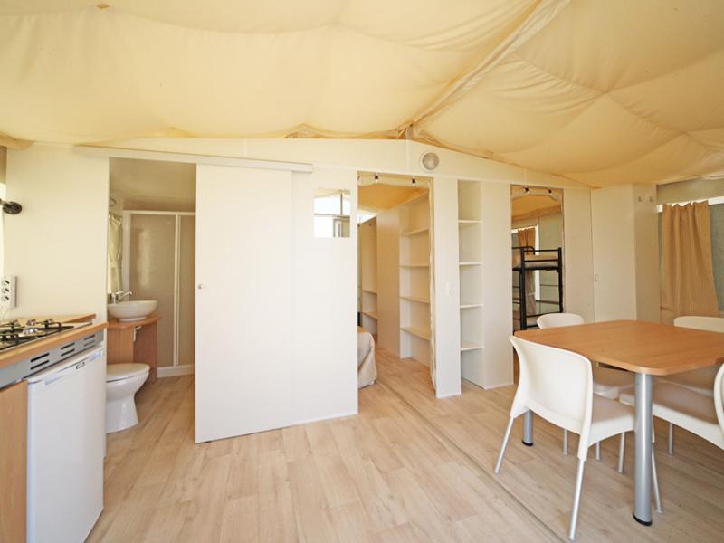 Obiekt będący złotym środkiem miedzy domkiem campingowym i namiotem, wygodny, ale także bardzo naturalny, z drewnianą podłogą, lekko uniesioną ponad poziom terenu, aby deszcz nie sprawiał problemów. Mieści do 5 osób.